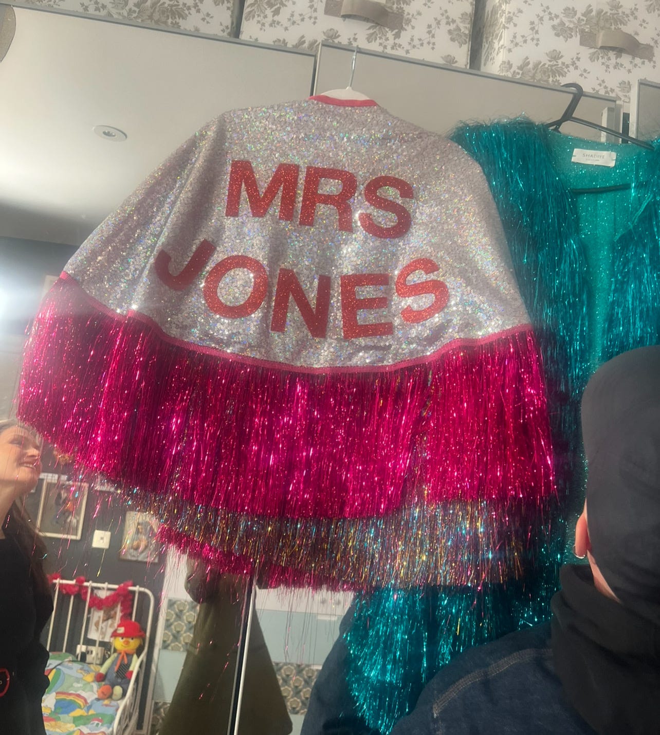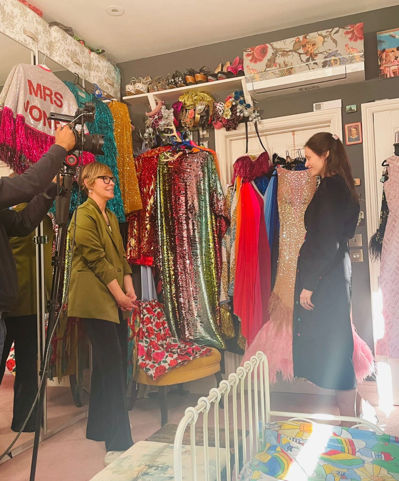 I could not have loved Sophie more for telling me that she felt compelled to do what I do before any cameras ever come round - that is, simply heave ho tons of cluttered clothes into another into another room and just them return them to the chaos as soon as the cameras are gone. And yet still she got a call from a decluttering company offering their services the second the segment aired. She and I also share the view that there’s no such thing as saving your clothes ‘for good’. If it just feels right to wear sequins to Sainsburys, that is your right. And, also like me, Sophie struggles to let go of her clothes. She’s built up a collection that means she’s guaranteed to be able to pull out THE perfect thing for any event that gets thrown at her, but her wardrobe has been so lovingly curated over the years that every piece has a memory that’s special to her. It was another moment that made me realise how important I think what we wear is for our psyche. Oh and I could not resist trying on this Mrs Jones cape - that’s another thing we have in common, our husbands are both Mr Jones’s.