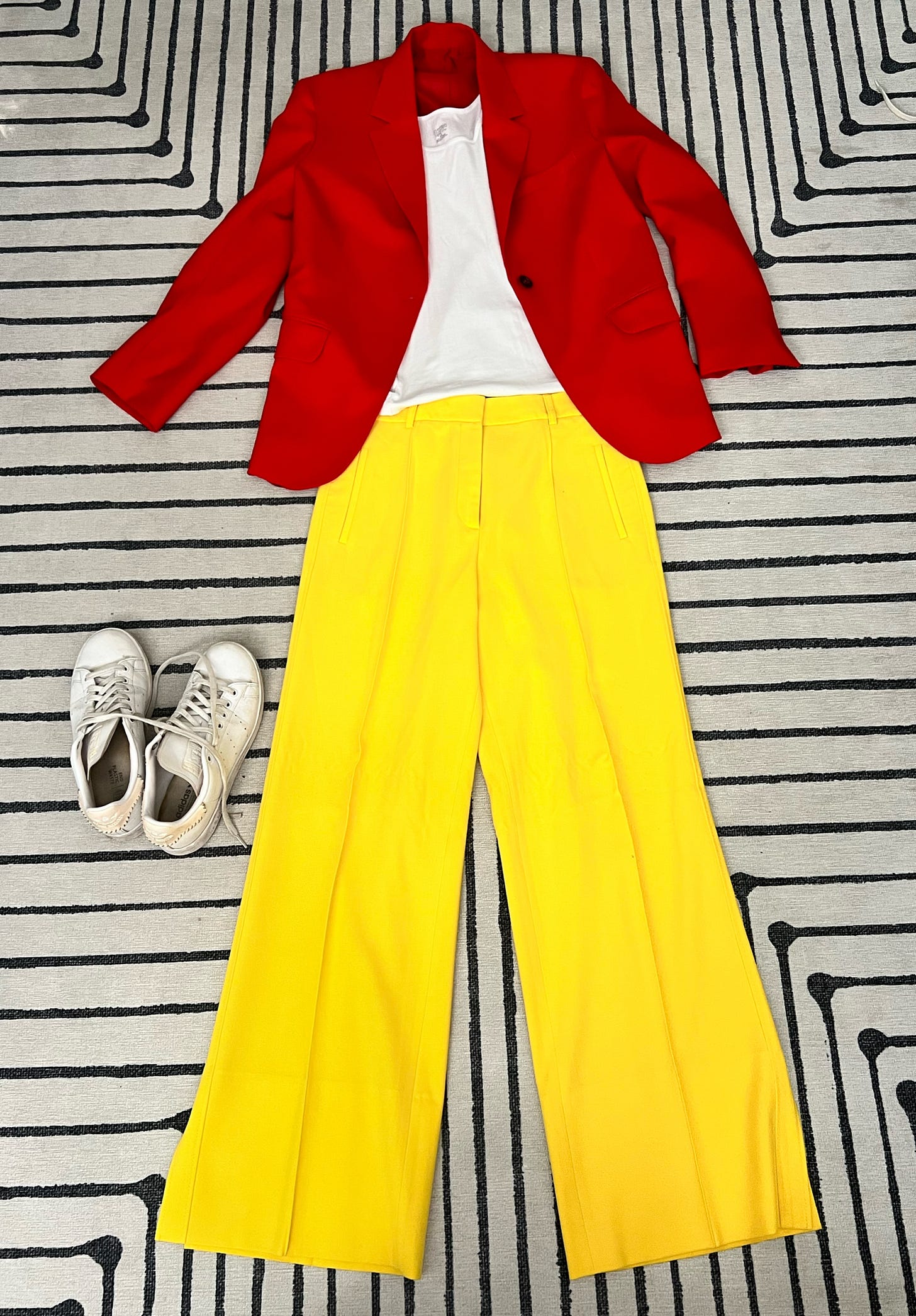 These ochre (unkind people might say ‘baby shit brown’) trousers have been a favourite of mine since I got hold of them last year. The Tory Sport brand is brilliant for elevated casual pieces, which has probably evolved into my main aesthetic these days. Anyway, the bold red is a great foil for them. Styled here with a simple, neutral top from Me+Em but I’d also add another colour block like this:
