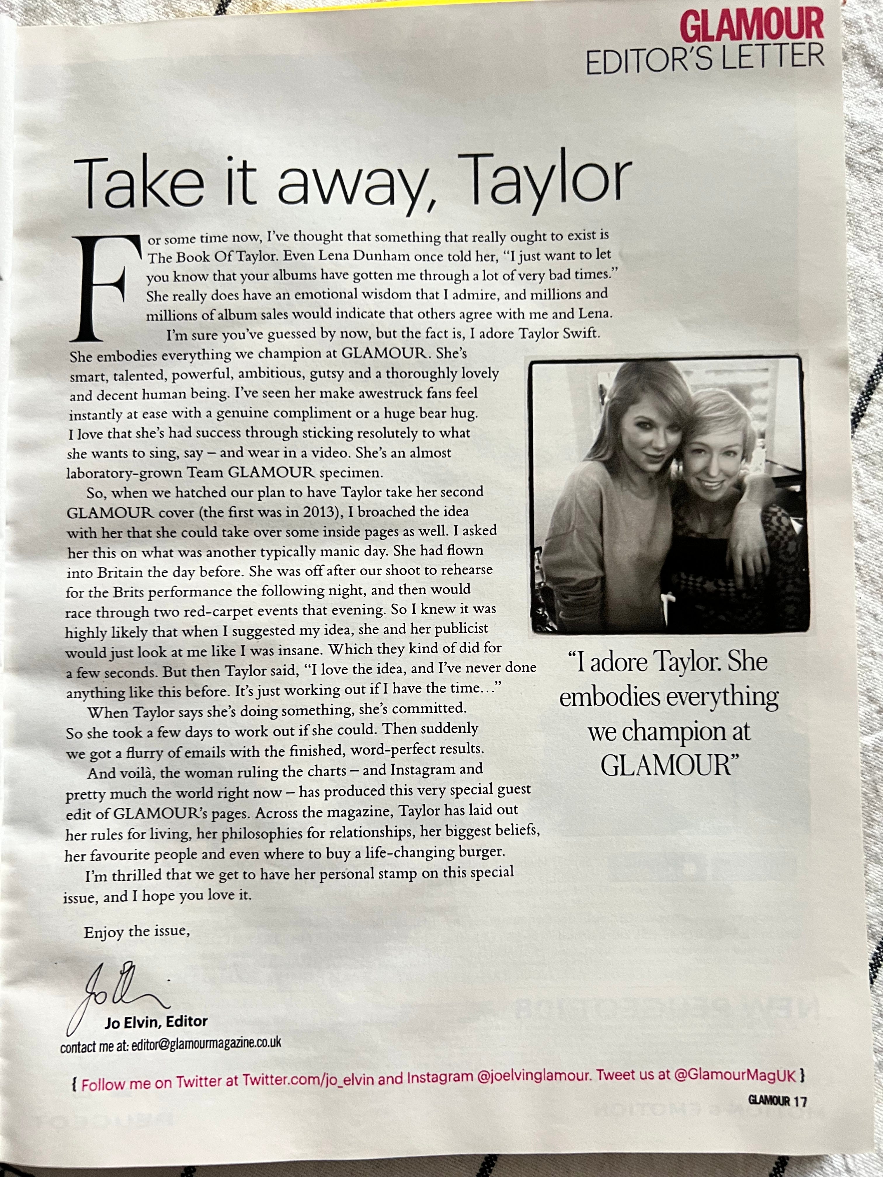 So the team and I thought of about half a dozen features we thought could be written by Taylor - feelgood stuff about her, her philosophies, her inspirations, friendship groups, stuff like that. (I wanted to strike the balance between having a nice presence of Taylor throughout the issue, but balanced with all the content Glamour readers would still expect to see.)